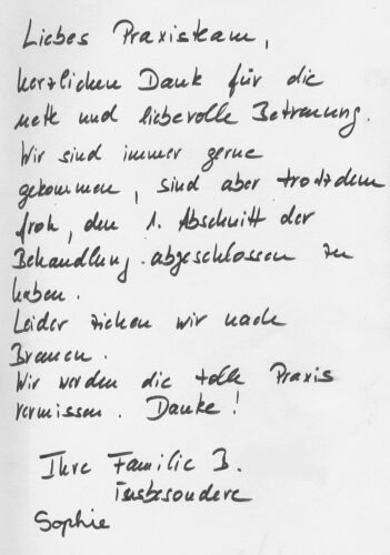 Liebes Praxisteam, herzlichen Dank für die nette und liebevolle Betreuung. Wir sind immer gerne gekommen, sind aber trotzdem froh, den 1. Abschnitt der Behandlung abgeschlossen zu