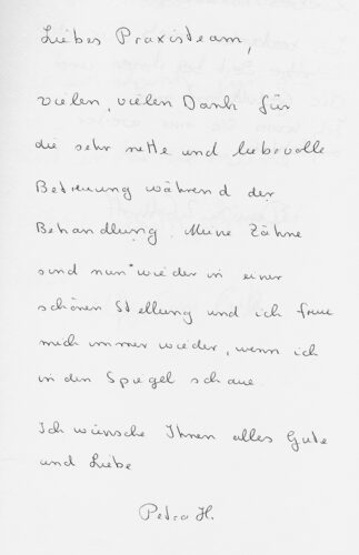 Liebes Praxisteam, vielen, vielen Dank für die sehr nette und liebevolle Betreuung während der Behandlung. Meine Zähne sind nun wieder in einer schönen Stellung und ich